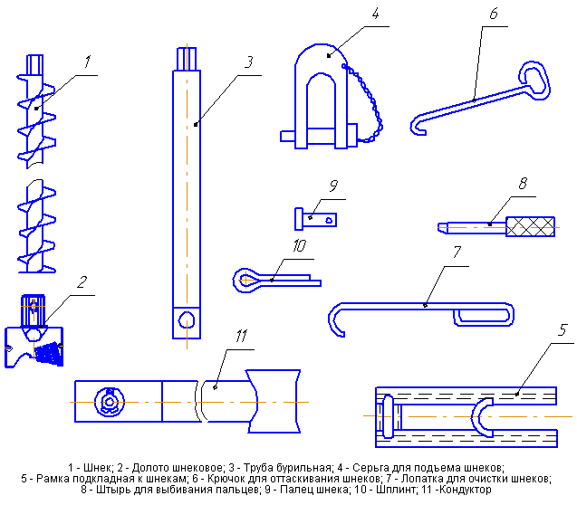 При бурении в мягких и рыхлых породах применяют двух- и трехлопастные долота режущего типа со спиральными или плоскими лезвиями, армированными твердым сплавом. Для пород средней твердости, где нужна более высокая износостойкость, применяют долота округленного профиля со значительно большей насыщенностью твердым сплавом. Основой бурового инструмента для шнекового бурения служат буровые шнеки составляющие колонну с непрерывной спиральной ребордой от полота или коронки на забое до поверхности. В зависимости от разновидности бурения применяют три основных вида шнеков: обычные, в том числе и утяжеленные, магазинные и полые. Наиболее часто применяют обычные буровые шнеки. Шнеки соединяются между собой посредством шестигранников или трехгранников, передающих момент вращения, и пальцев, воспринимающих осевое усилие. Пальцы удерживаются шпильками. Шнеки поставляются в комплекте с пальцами и шпильками. Технические характеристики